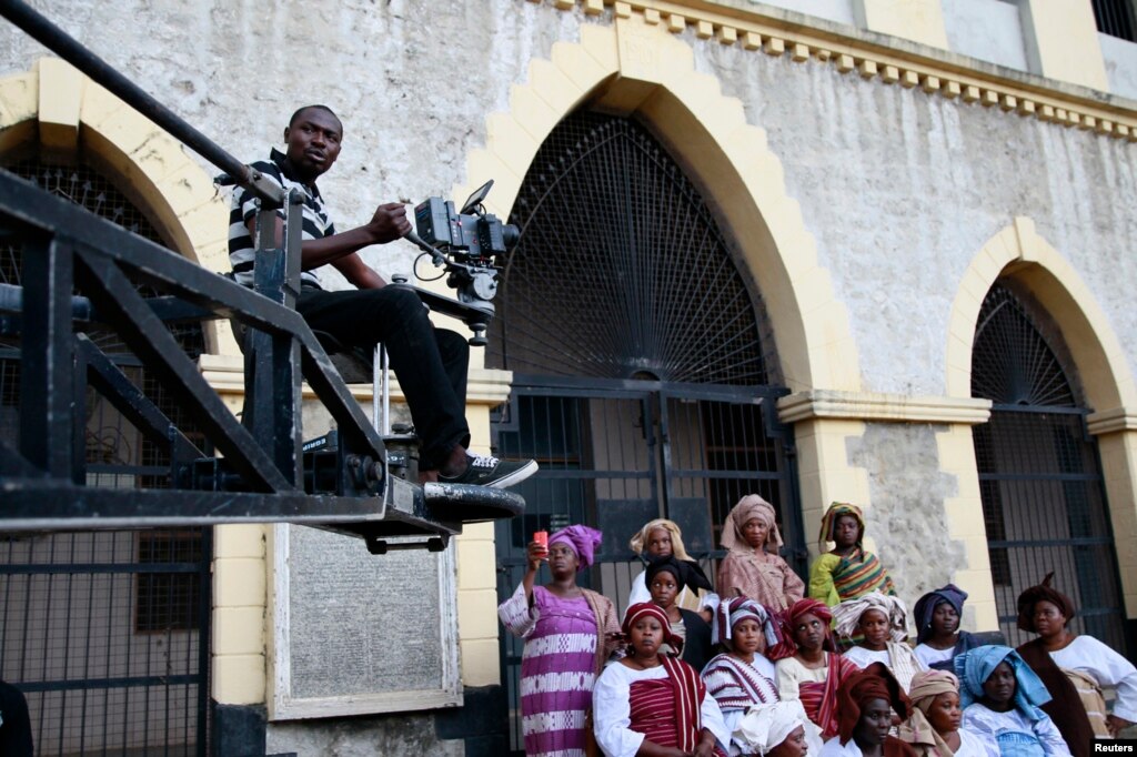FILE - A cameraman films a scene from a crane during the making of "Ake," a film based on the childhood memoirs of Nigerian writer Wole Soyinka, in Abeokuta, southwest Nigeria, July 14, 2013. Nigeria's movie business, often known as Nollywood, is one of the biggest in the world.