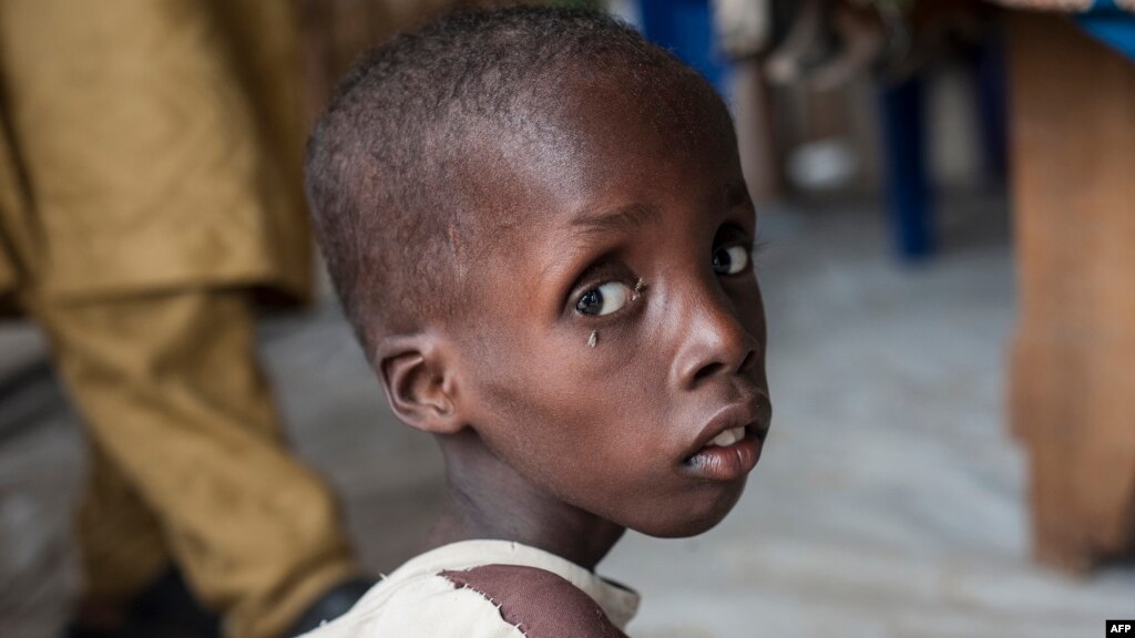 Boy suffering from severe acute malnutrition at a UNICEF nutrition clinic in the Muna informal settlement, which houses nearly 16,000 internally displaced people in the outskirts of Maiduguri, capital of Borno State, northeastern Nigeria, June 30, 2016.