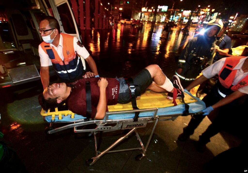 An injured man is helped by emergency rescue workers after an explosion on a passenger train in Taipei, Taiwan, Thursday, July 7, 2016.